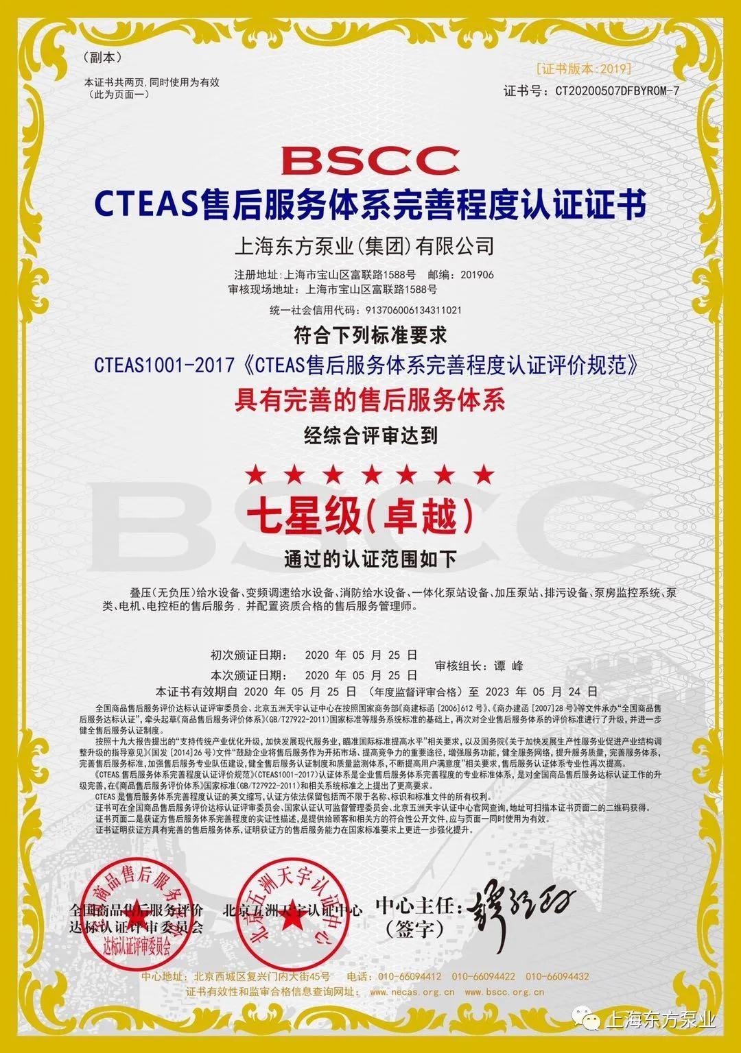 CTEAS售後服務體係完善程度認證證書獲得“七星級(卓越)”認證,為目前最高的售後服務認證等級,CTEAS七星級(卓越)shouhoufuwutixirenzhengshiqiyeshouhoufuwutixiwanshanchengdupingjiadezhuanyebiaozhuntixi,zaiguojiabiaozhunjichushangtichulegenggaoyaoqiu,huodezhengshudeqiyeyiweizhebujinjuyouwanshandeshouhoufuwutixi,shouhoufuwunenglizaiguojiachuyuyiliushuiping。