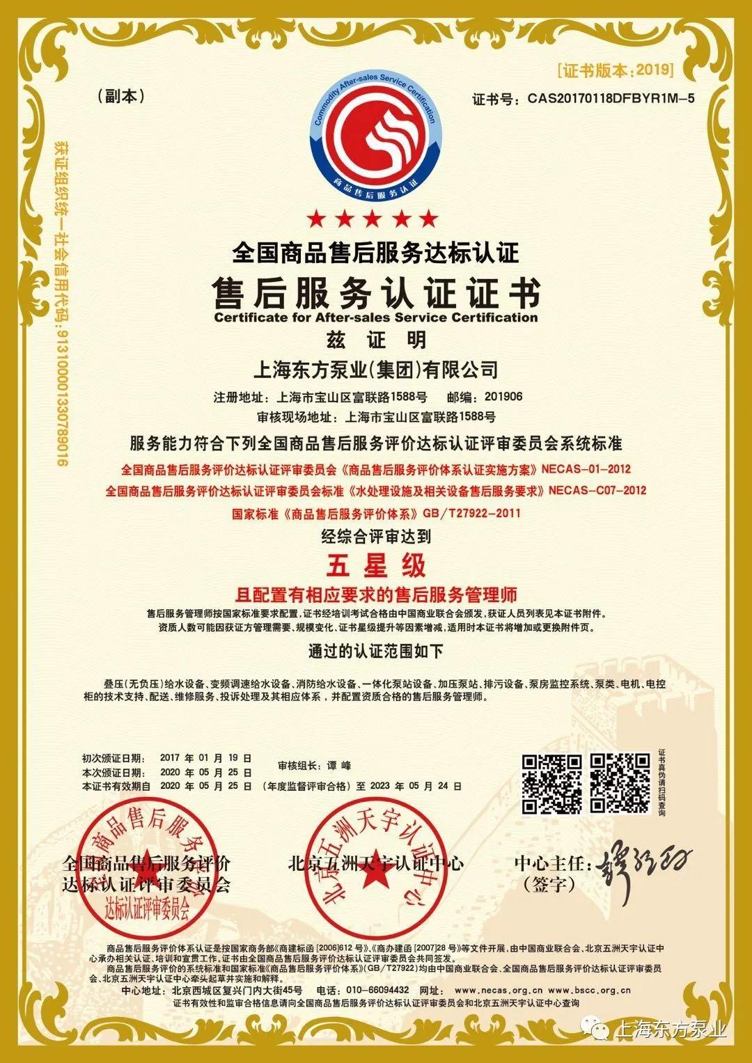 東方泵業七星級(卓越)售後服務體係認證證書的獲評,意味著東方泵業售後在服務功能、服務網絡、服務質量、服務體係、服務標準等方麵居於國內領先水平。