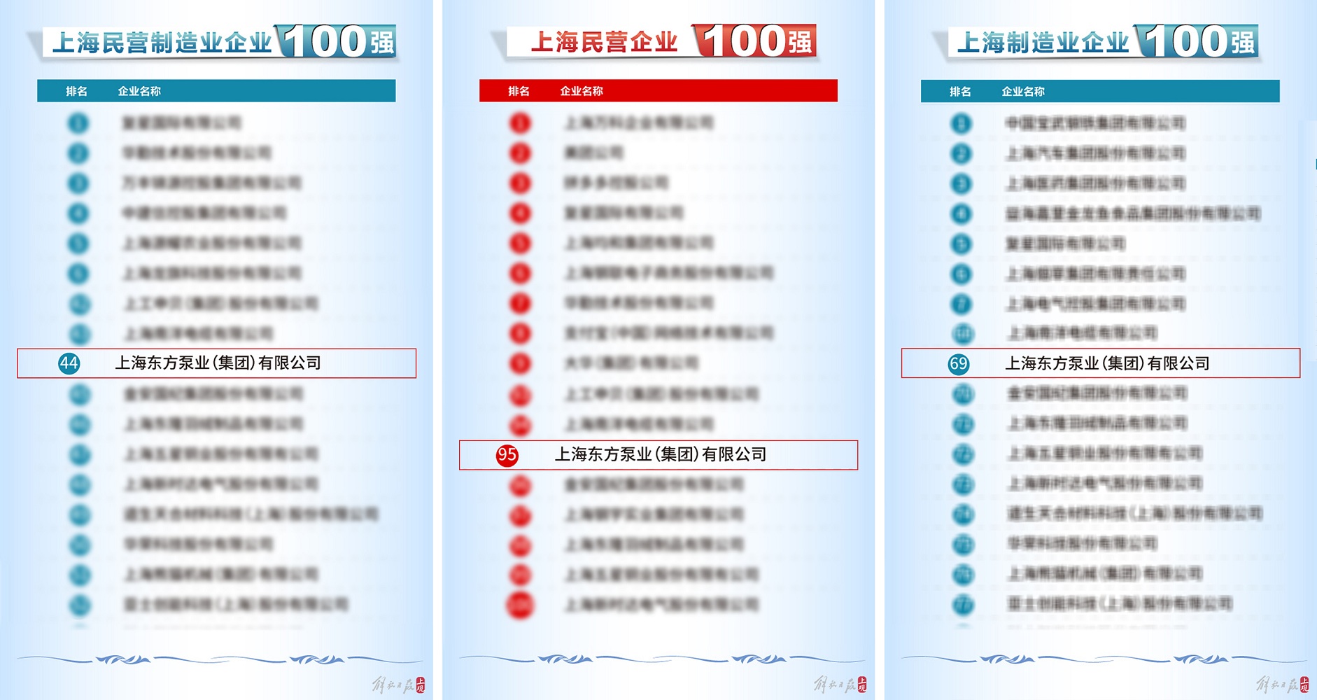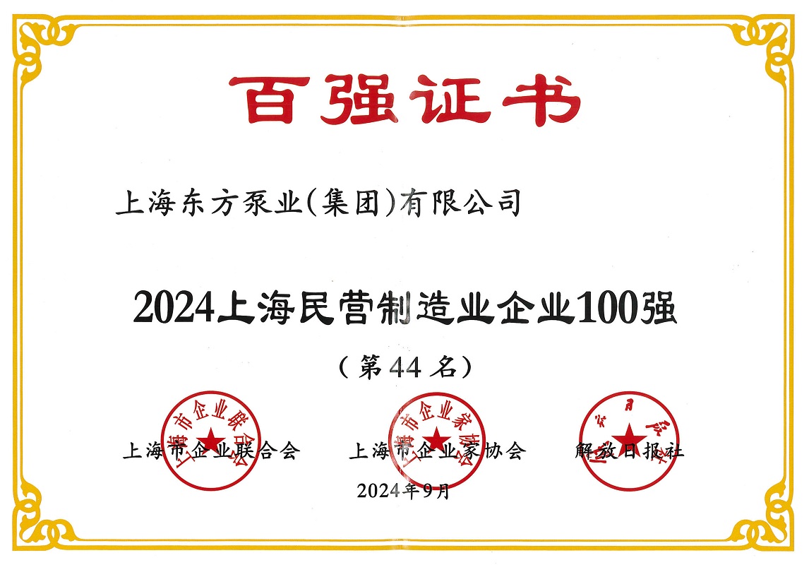近日,2024上海百強企業發布會順利召開並發布了多項百強企業榜單。上海東方泵業(集團)有限公司在此次評選中榮獲2024上海民營企業100強(第95名)、2024上海民營製造業企業100強(第44名)、2024上海製造業企業100強(第69名)。