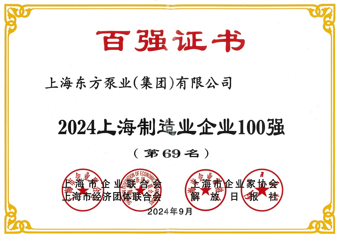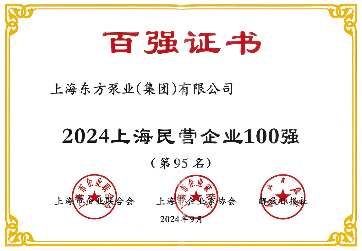近日,2024上海百強企業發布會順利召開並發布了多項百強企業榜單。上海東方泵業(集團)有限公司在此次評選中榮獲2024上海民營企業100強(第95名)、2024上海民營製造業企業100強(第44名)、2024上海製造業企業100強(第69名)。